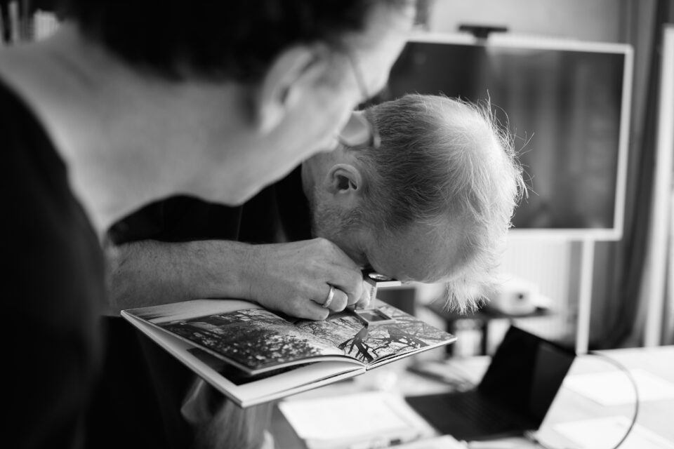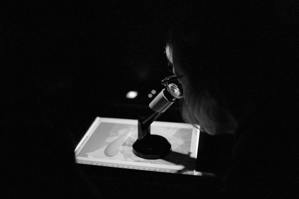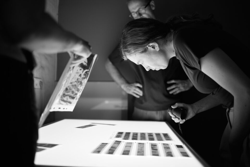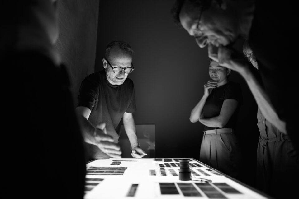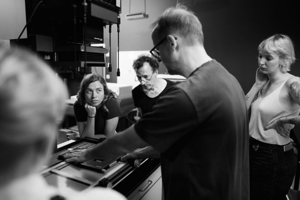 After a short break, the equipment and tools for professional work in the darkroom will be presented – such as enlargers, enlarging frames, the various dodgers and post-exposure masks or the grain focus adjuster. The work processes are demonstrated in the light, the workshop participants can familiarise themselves with the equipment and are advised and accompanied by Nikolaus Brade when setting up their workstations. After a test demonstrated by him, which includes all processes, the results and possible corrections of filter values are discussed together.
